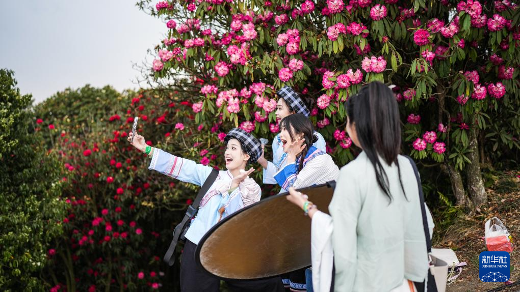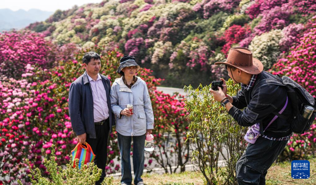 游客在毕节市百里杜鹃金坡景区合影留念(3月29日摄)。
