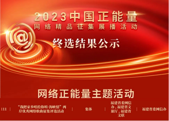 海峡网3月30日讯(记者 叶卢苗艺)3月30日,由中央网信办主办的2023中国正能量网络精品征集展播活动结果揭晓。“我把家乡唱给你听·海峡情”两岸优秀网络歌曲征集评选活动获得网络正能量活动精品作品大奖。据悉,2023中国正能量网络精品征集展播活动经过初选、专家审核评议、网络展播投票、终选公示、以及公布结果,权威性、含金量极高。