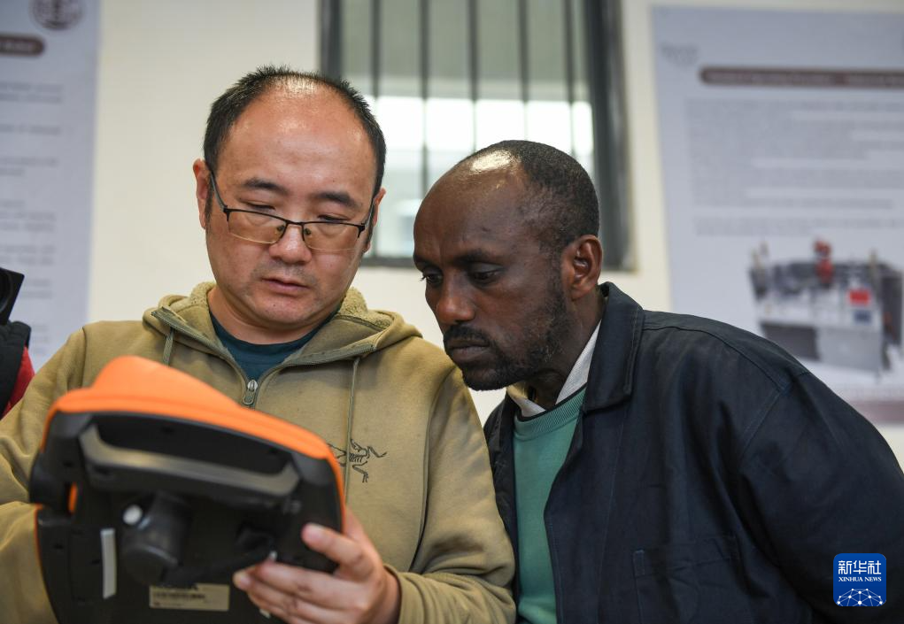 面向未来,中非携手推进多领域人才合作 2024年2月15日,在亚的斯亚贝巴的埃塞俄比亚联邦职业技术培训学院,鲁班工坊中方负责人江绛(左)与当地教师约纳斯·阿凯莱交流教学内容。 新华社记者 李亚辉 摄 |