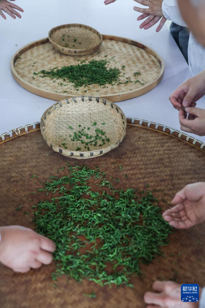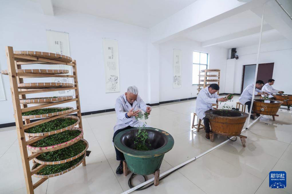 4月7日,在位于浙江金华的浙江采云间茶业有限公司内,婺州举岩传统制茶技艺非遗传承人潘金土(左一)带领制茶师进行举岩茶的杀青工艺。
