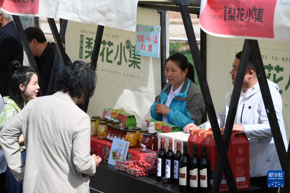 4月8日,游人在镇罗营梨花谷雨休闲季活动现场的“梨花小集”中了解农产品信息。