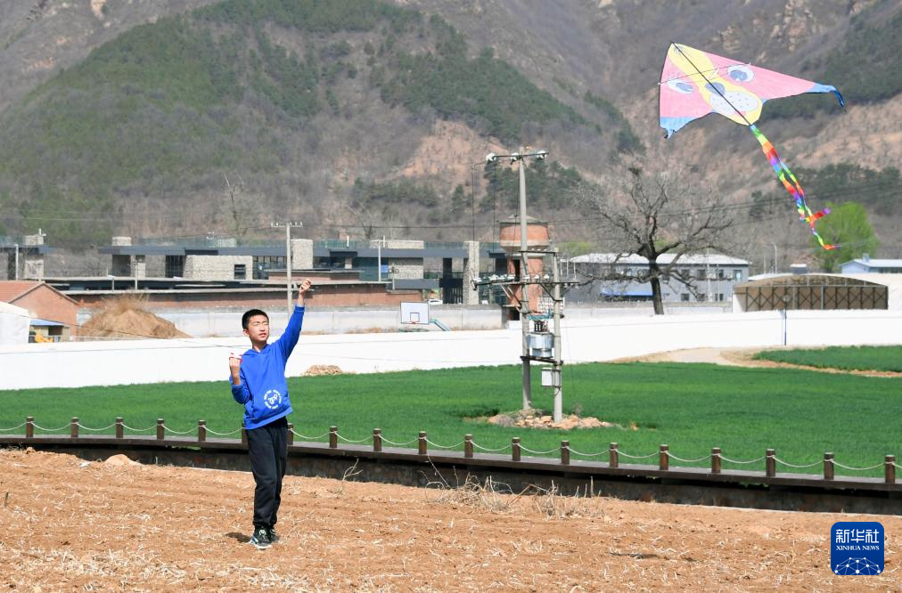 4月8日,小朋友在北京市平谷区镇罗营镇轮休田间放风筝。