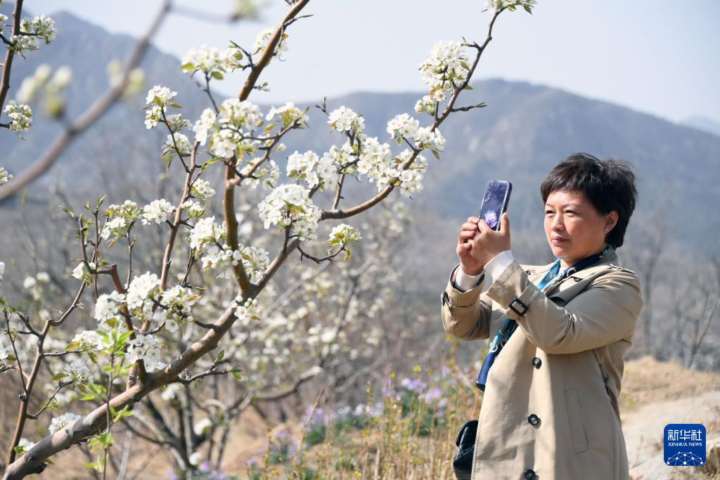 4月8日,游人在北京市平谷区镇罗营镇赏梨花。