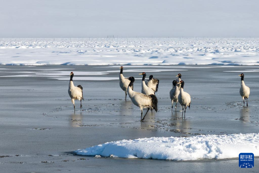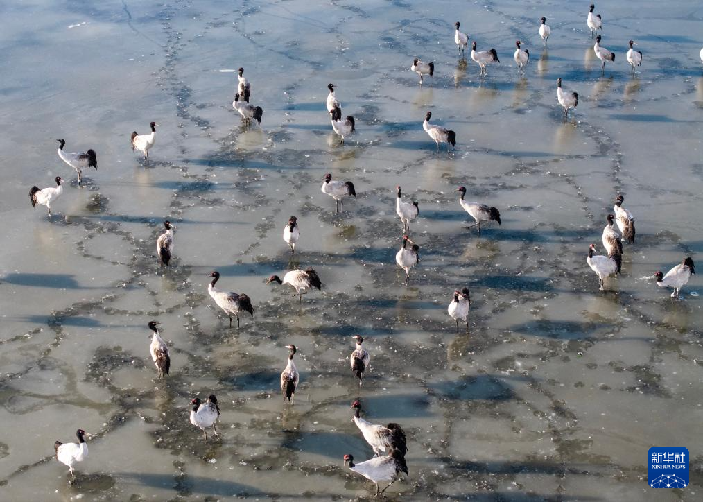 这是4月7日在阿热湿地拍摄到的迁徙途中的黑颈鹤(无人机照片)。