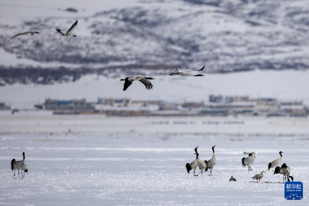 这是在阿热湿地拍摄到的迁徙途中的黑颈鹤(无人机照片,4月7日摄)。