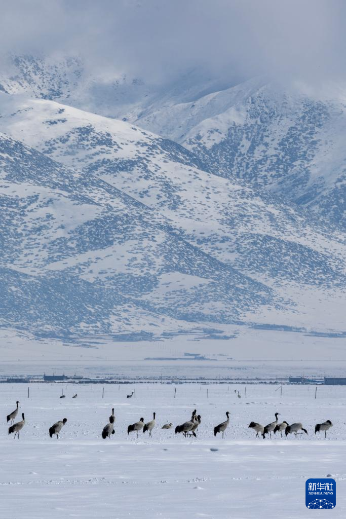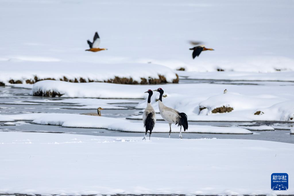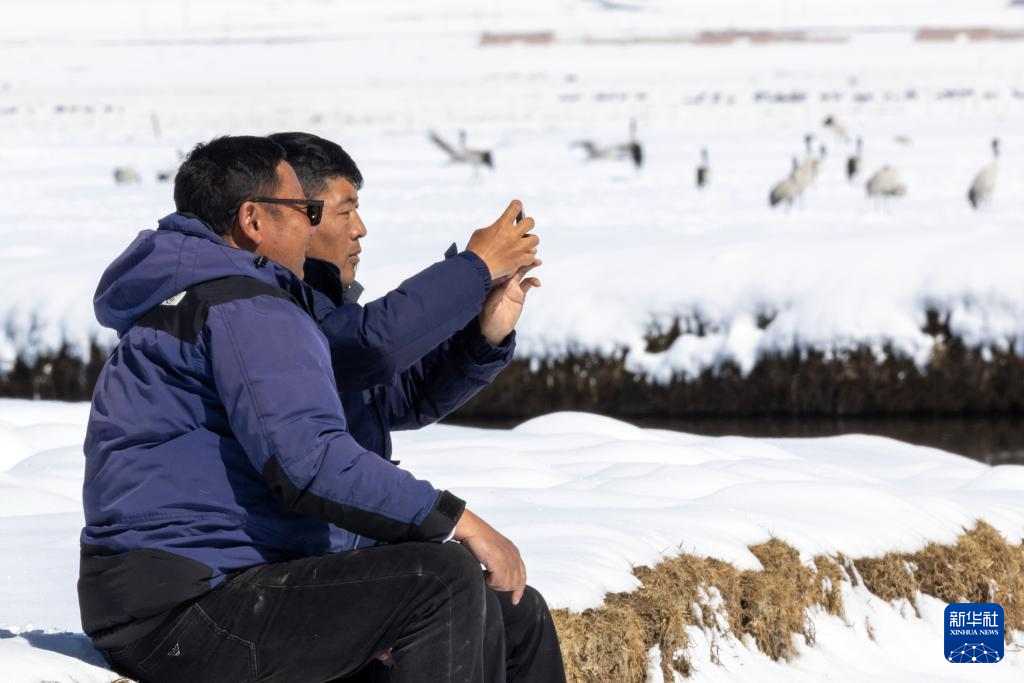 尼玛顿珠(左)和同事扎西顿珠在雪后的阿热湿地观察迁徙途中的黑颈鹤(4月7日摄)。