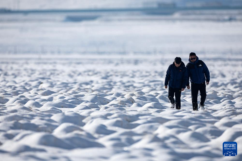 尼玛顿珠(右)和同事扎西顿珠在雪后的阿热湿地徒步巡护(4月7日摄)。