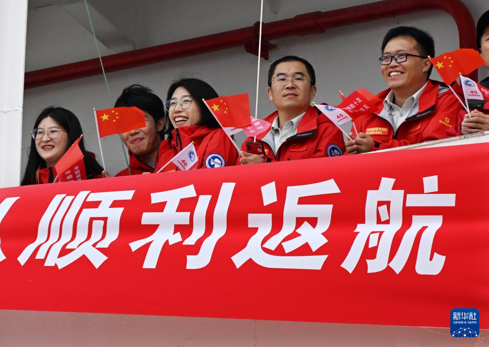 4月10日,青岛奥帆基地码头,科考队员在“雪龙”号上挥舞旗帜。