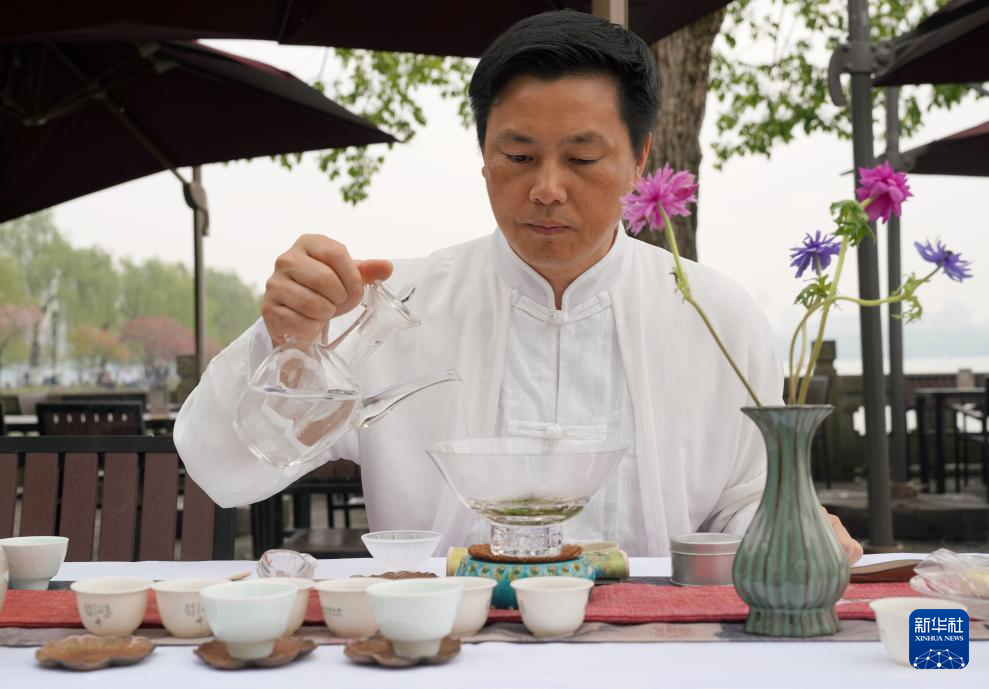 4月10日,杭州西湖景区平湖秋月景点,志愿者在“亭亭茶会”上进行茶艺展示。