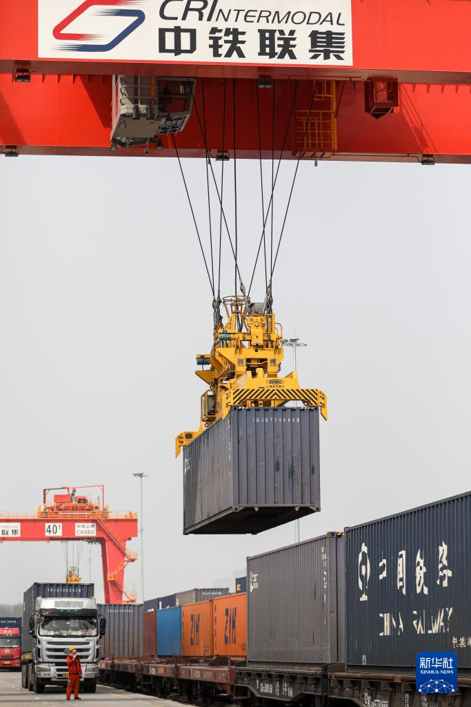 4月11日,在国铁集团郑州局圃田站,中铁联集的龙门吊向货运列车上装载集装箱。
