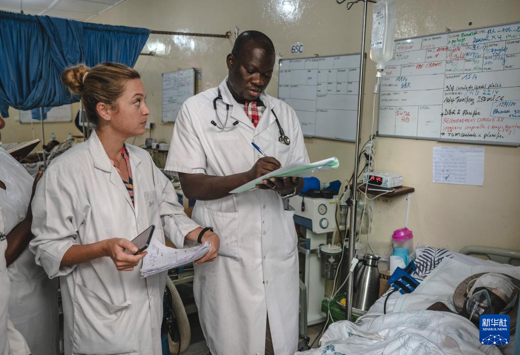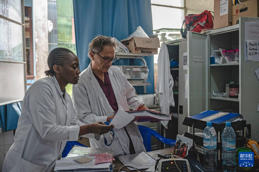 4月13日,医生在刚果(金)东部北基伍省戈马市的恩多绍医院内交流。 恩多绍医院位于刚果(金)东部北基伍省首府戈马市,拥有80余张固定床位和约20名医护人员。近年来,包括北基伍省在内的刚果(金)东部地区安全形势严峻,造成大量人员伤亡,当地许多医疗机构也被迫关闭。作为戈马市唯一一家接收冲突伤员的医疗机构,恩多绍医院为缓解就诊压力在院内停车场搭建临时帐篷,将床位总数增至约130张。 新华社记者 王冠森 摄