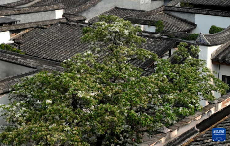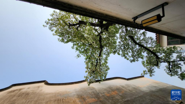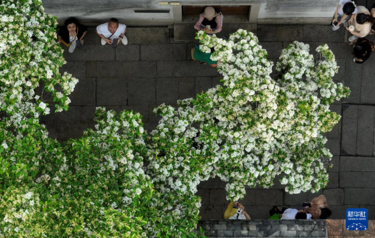 近日,福州千年古街三坊七巷衣锦坊里的一株百年流苏树繁花盛开,吸引市民和游客驻足观赏、拍照。