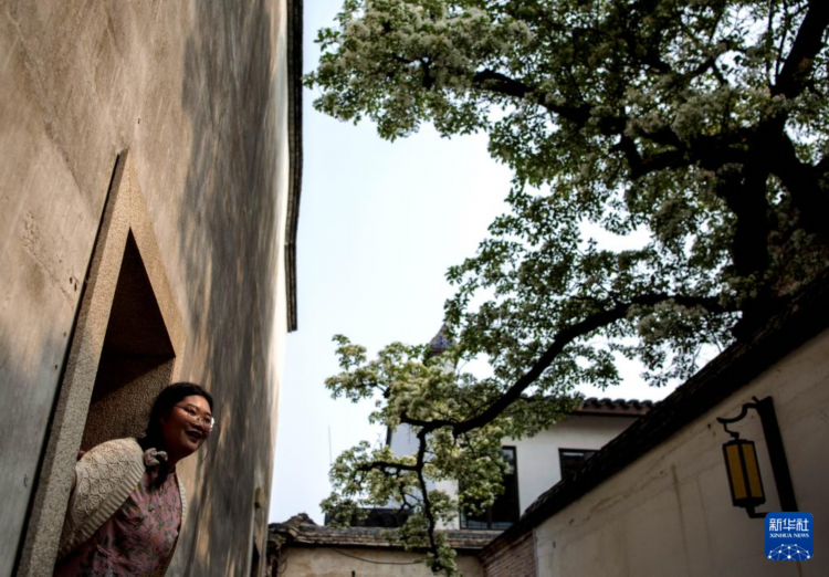 流苏花映衬下的粉墙黛瓦(4月14日摄,手机照片)。