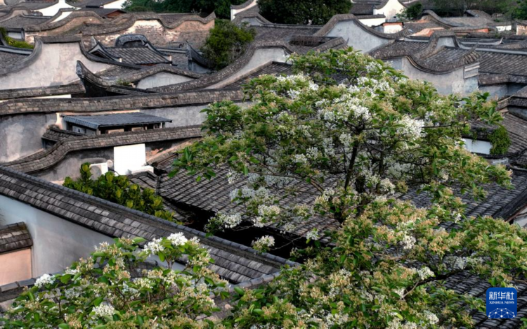 流苏花映衬下的古厝屋顶(4月14日摄,无人机照片)。