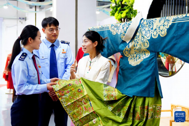 4月13日,在曹县有爱云仓汉服基地,工作人员在加工马面裙。