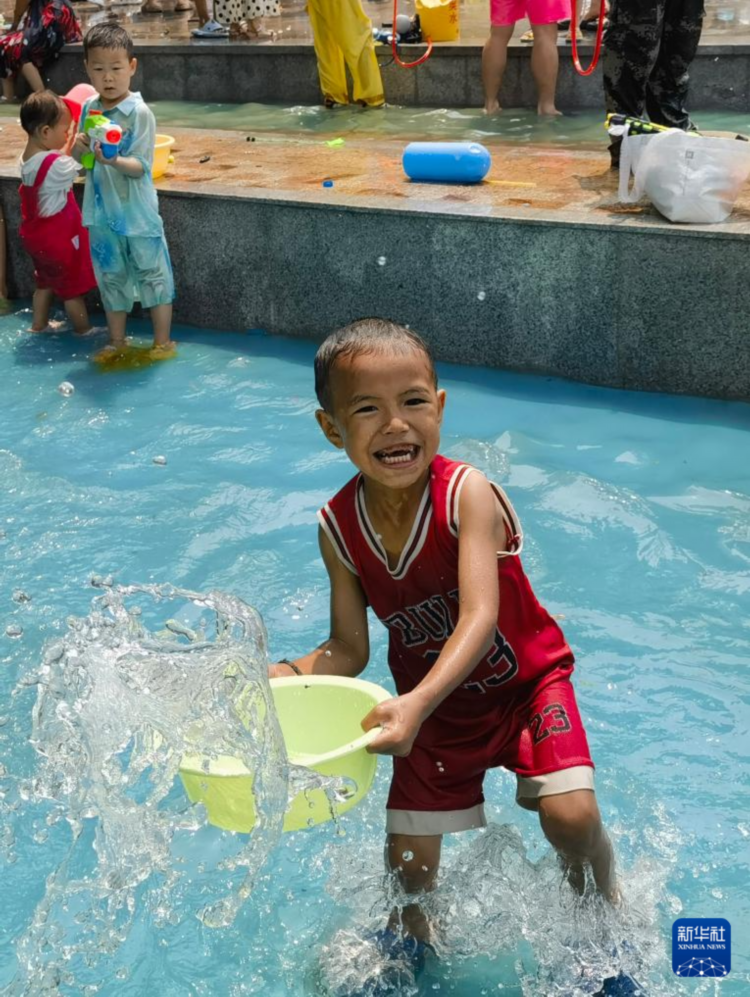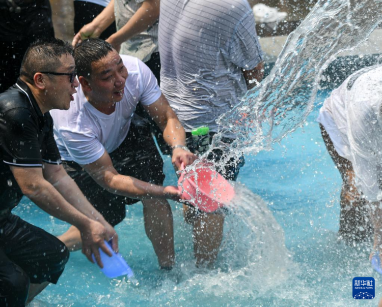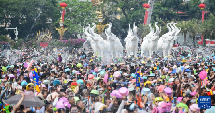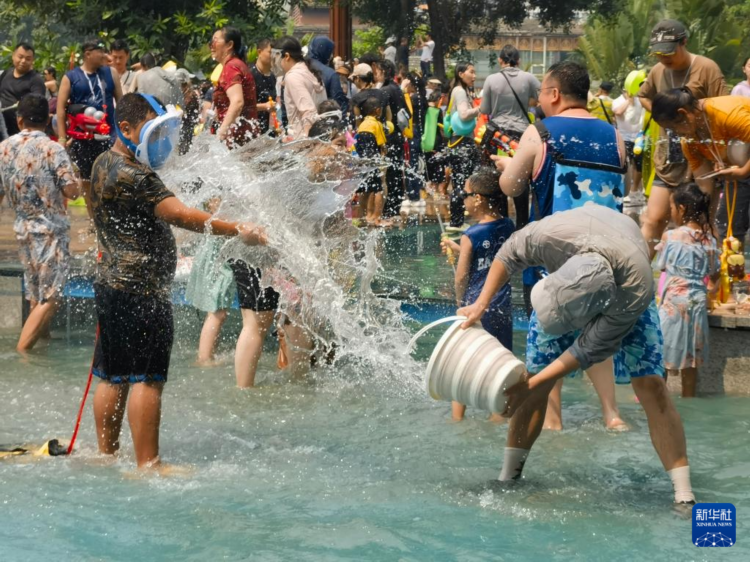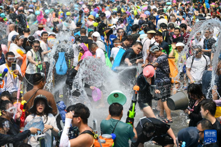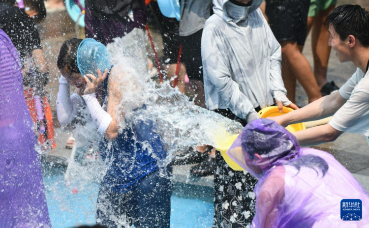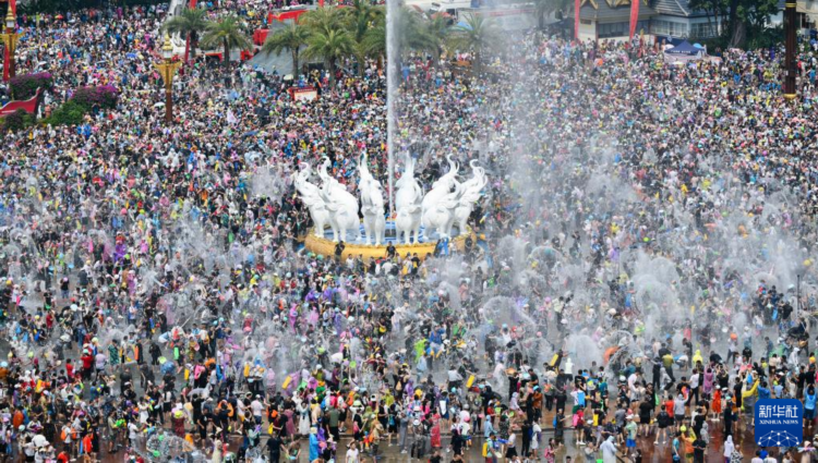 当日,云南省西双版纳傣族自治州举行泼水狂欢活动,人们欢聚在景洪市泼水广场,用相互泼水的方式互送祝福,庆祝泼水节。