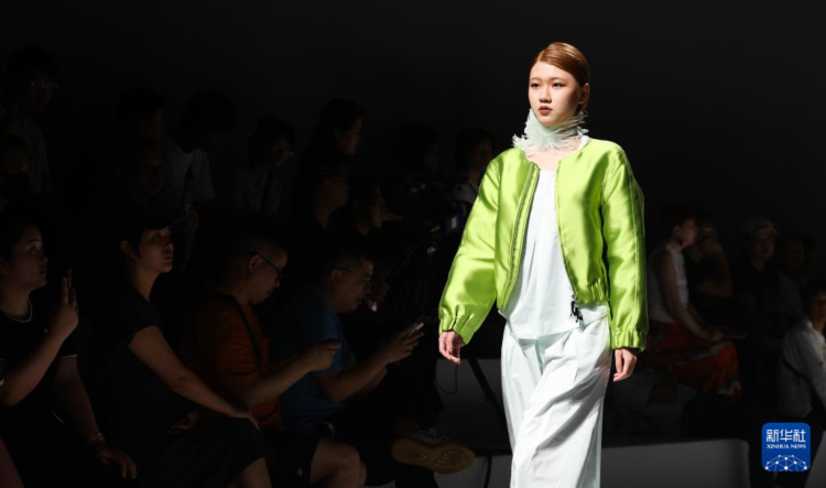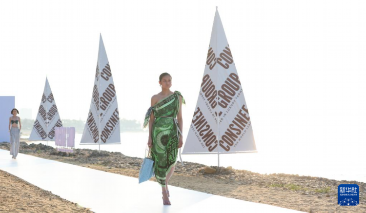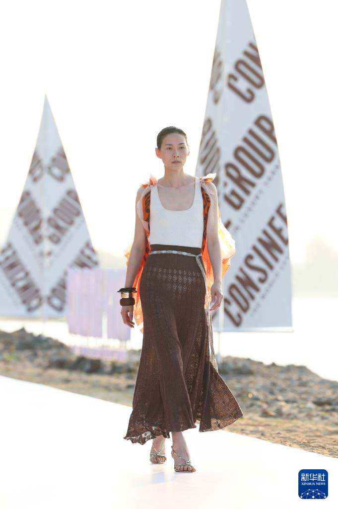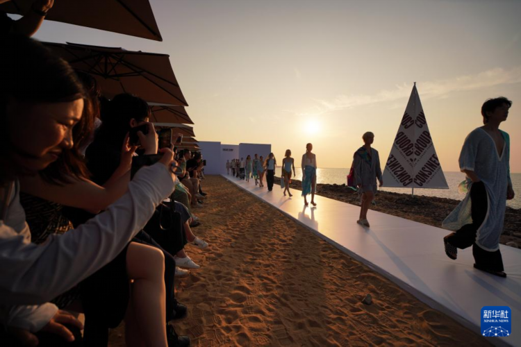 4月15日,在位于海口的消博会海边秀场,模特在展示时装作品。