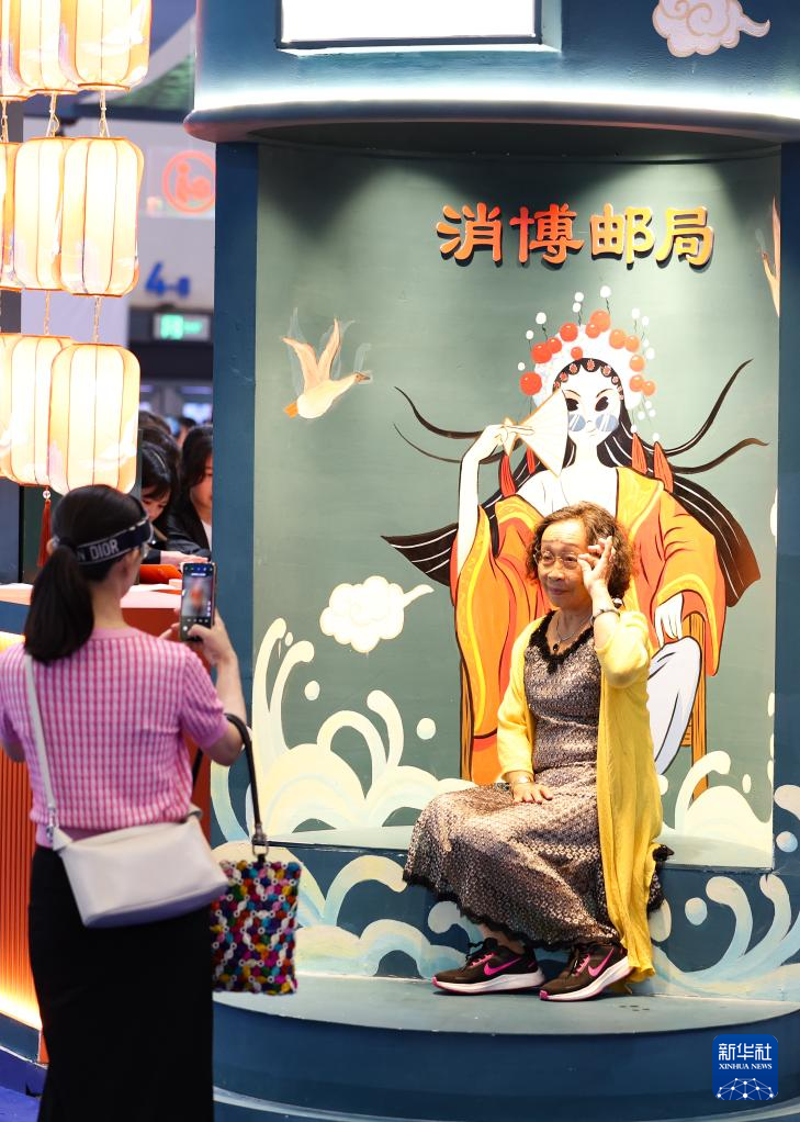 4月15日,观众在第四届消博会上中国邮政打造的消博邮局展区留影。