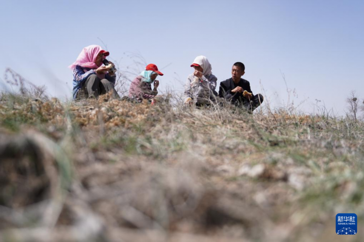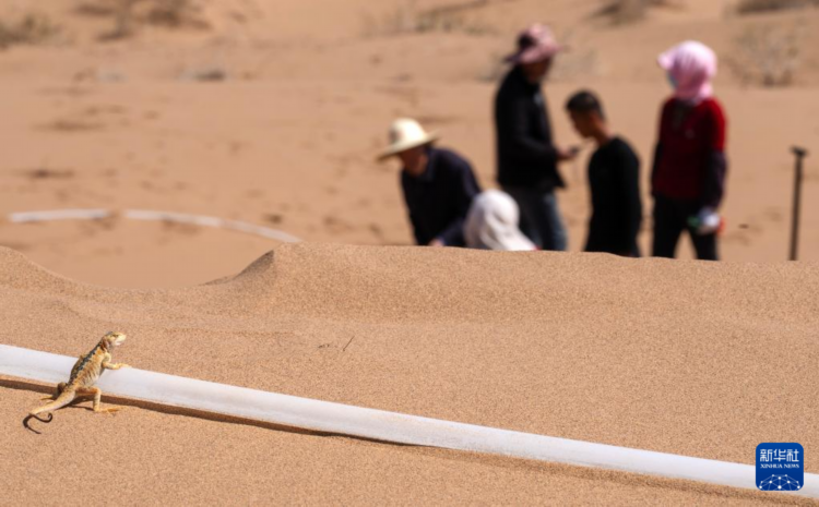 4月10日,在古浪县八步沙林场麻黄塘沙区,郭万刚(左一)和郭玺(右二)在沙漠里种植花棒时,一只被当地人称为“沙娃娃”的蜥蜴在一旁。新华社记者 费茂华 摄