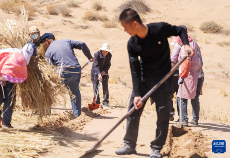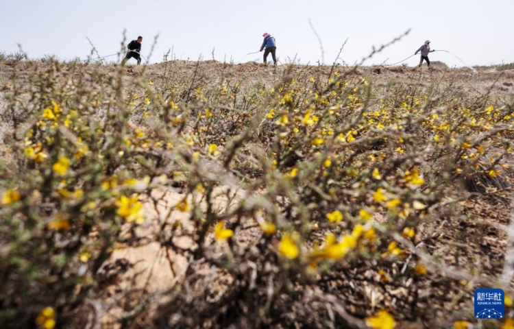 4月10日,在古浪县八步沙林场麻黄塘沙区,郭玺(中)和同伴一起种植花棒。新华社记者 范培珅 摄
