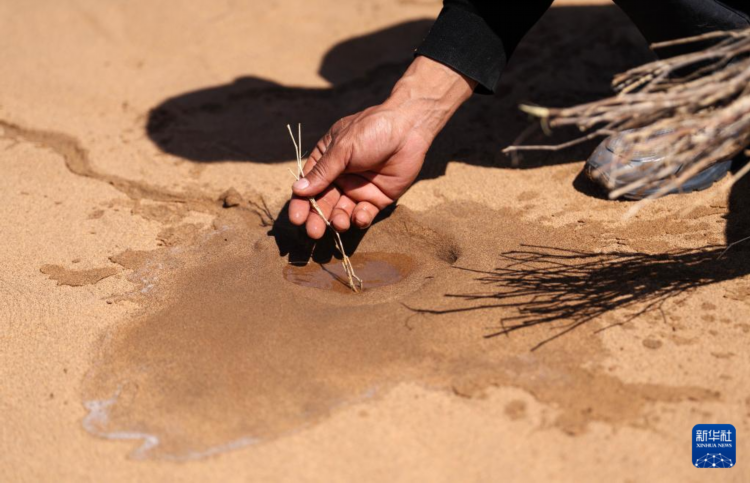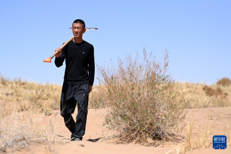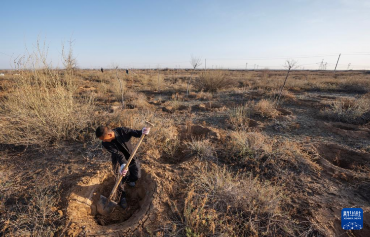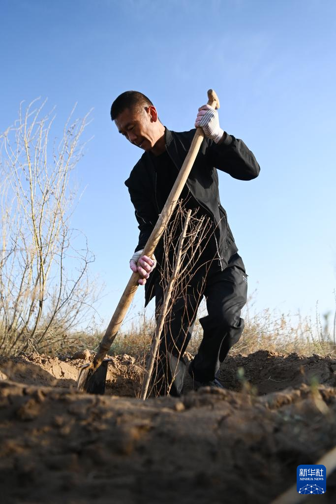 4月10日,在古浪县八步沙林场麻黄塘沙区,郭玺在沙漠里种植花棒。新华社记者 费茂华 摄
