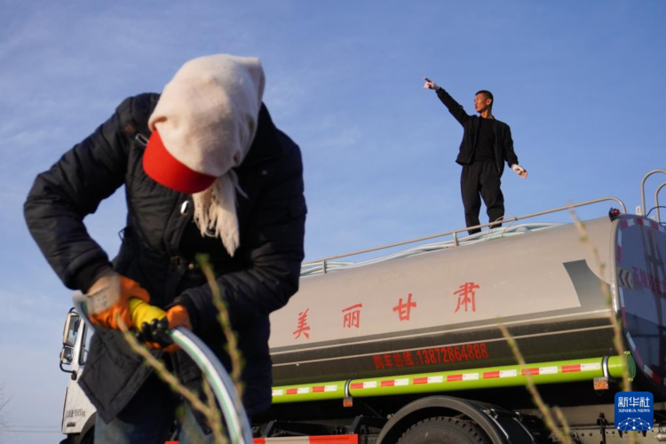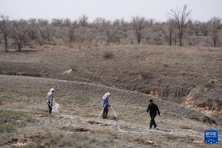 4月10日,在古浪县八步沙林场眼窝子沙治沙点,郭玺(右)协调林场职工浇水。新华社记者 马希平 摄
