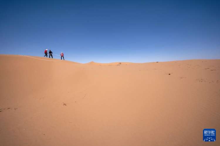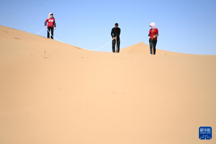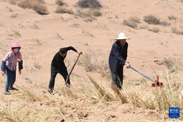 4月10日,在古浪县八步沙林场麻黄塘沙区,郭玺(中)和同伴在沙漠里种植花棒。新华社记者 费茂华 摄