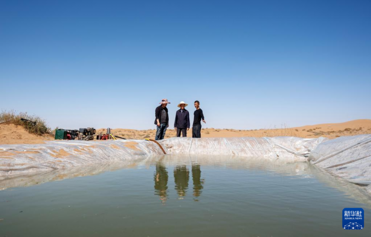 4月10日,在古浪县八步沙林场麻黄塘沙区,八步沙第二代治沙人郭万刚(中)和郭玺(右)查看沙漠里的蓄水池。新华社记者 费茂华 摄
