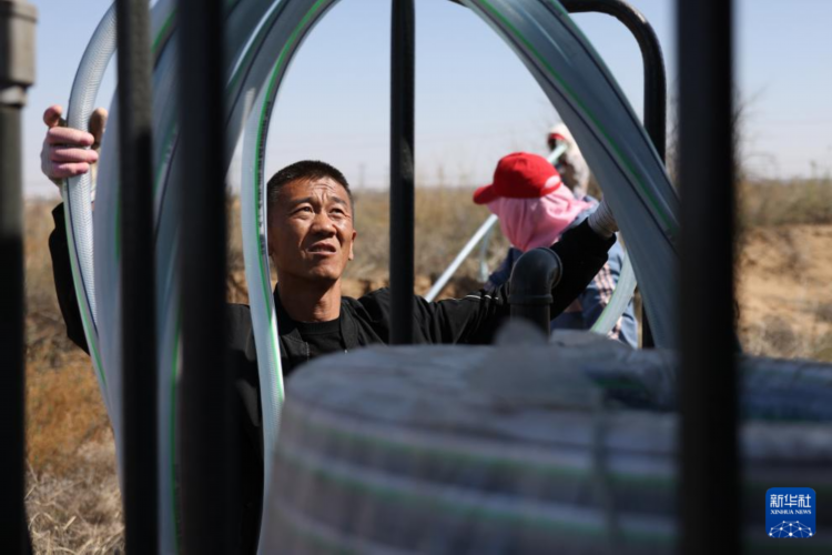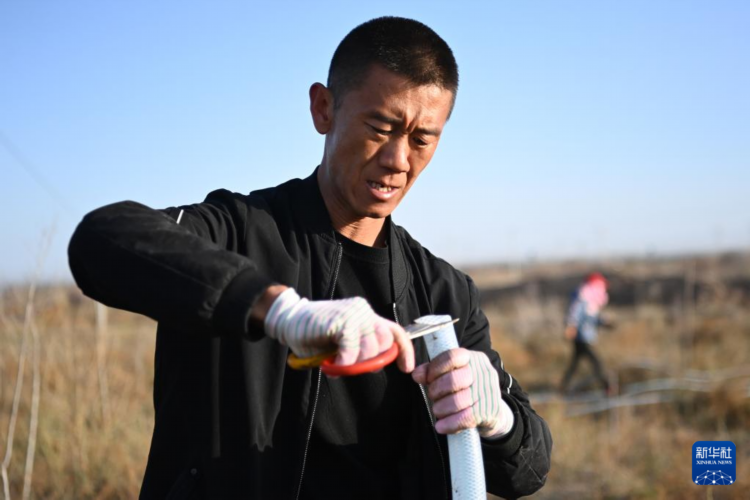 4月10日,在古浪县八步沙林场眼窝子沙治沙点,郭玺维修浇树的水管。新华社记者 范培珅 摄