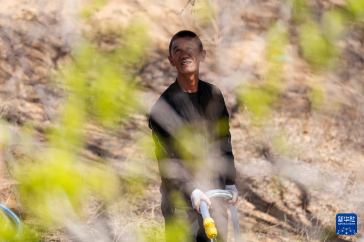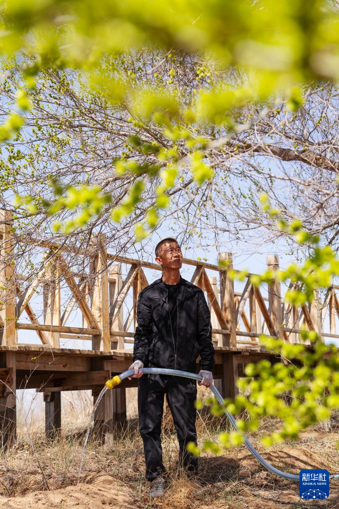 4月10日,在古浪县八步沙林场眼窝子沙治沙点,郭玺浇灌植被。新华社记者 费茂华 摄