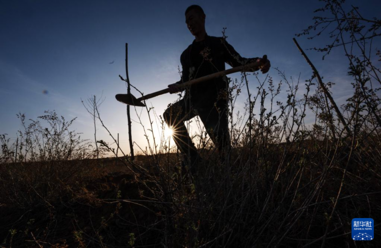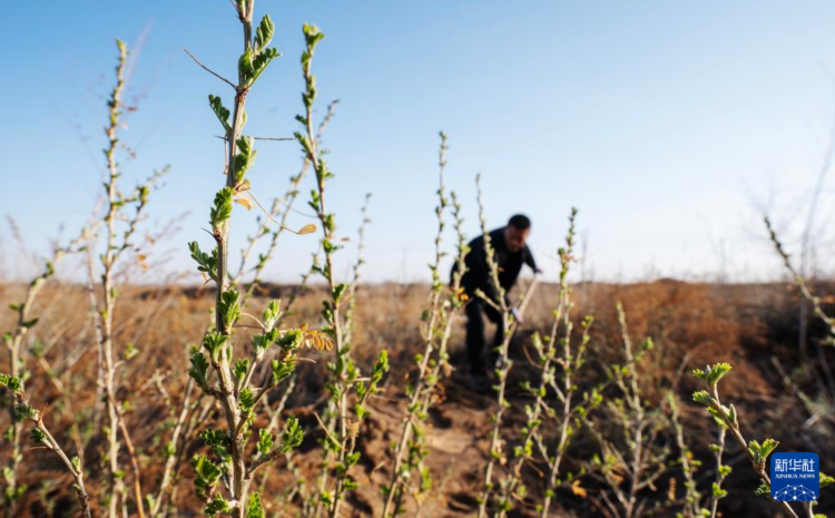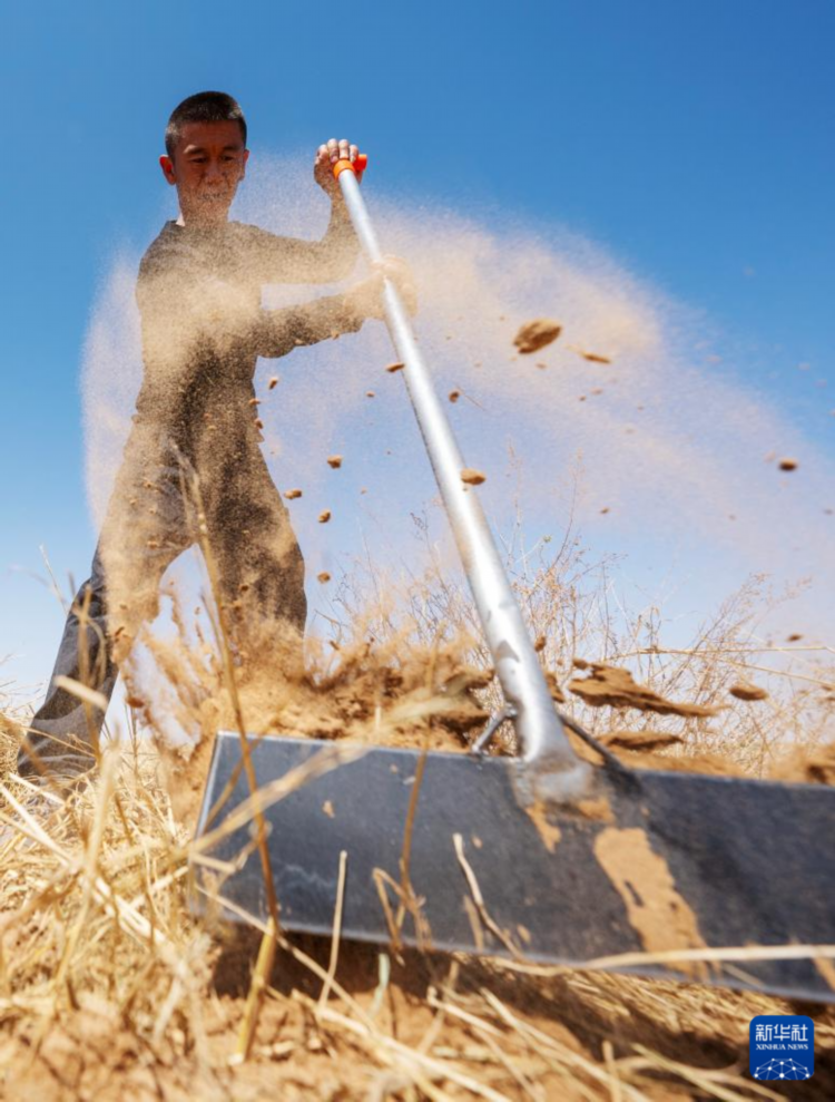 4月10日,在古浪县八步沙林场眼窝子沙治沙点,郭玺用铁锹整理树坑。新华社记者 范培珅 摄