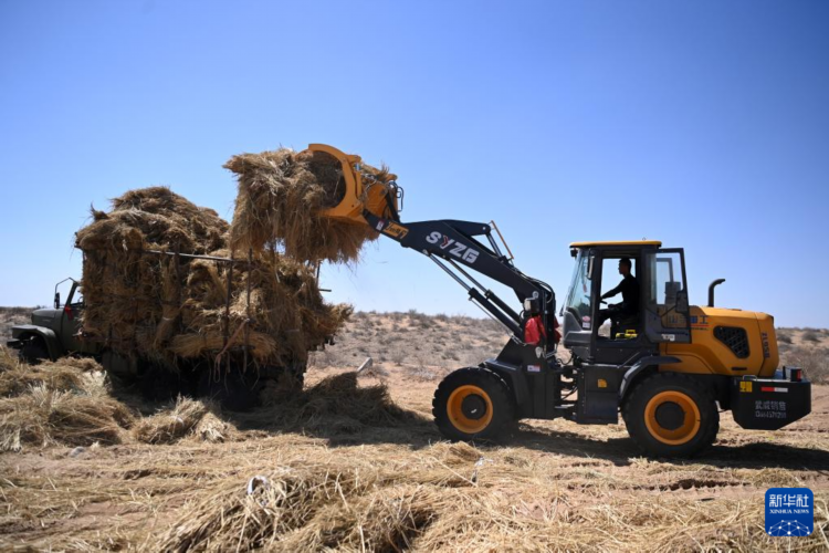 4月10日,在古浪县八步沙林场麻黄塘沙区,郭玺驾驶装草机转运压沙用的稻草。新华社记者 范培珅 摄