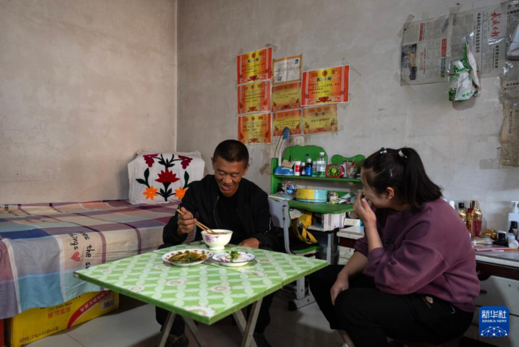 4月10日,在古浪县土门镇,郭玺和妻子一起吃晚饭。新华社记者 费茂华 摄