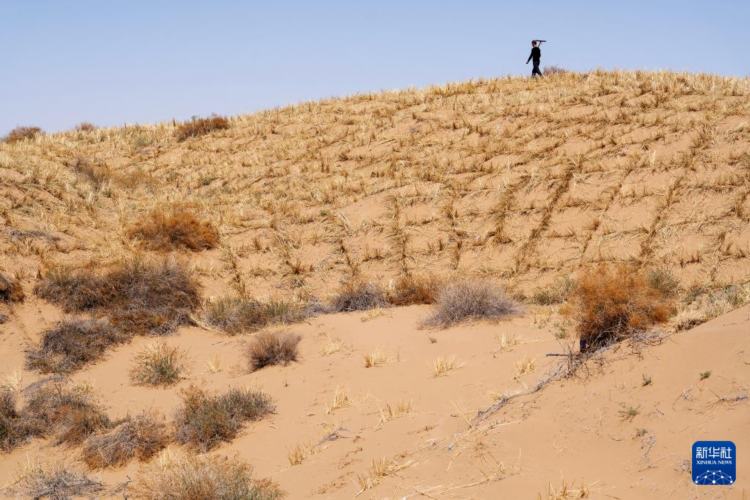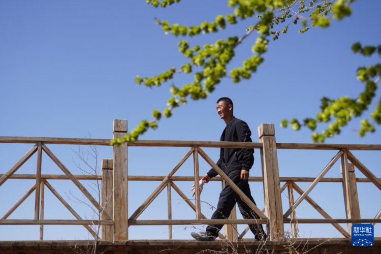 4月10日,在古浪县八步沙林场眼窝子沙治沙点,郭玺察看树木生长情况。新华社记者 马希平 摄
