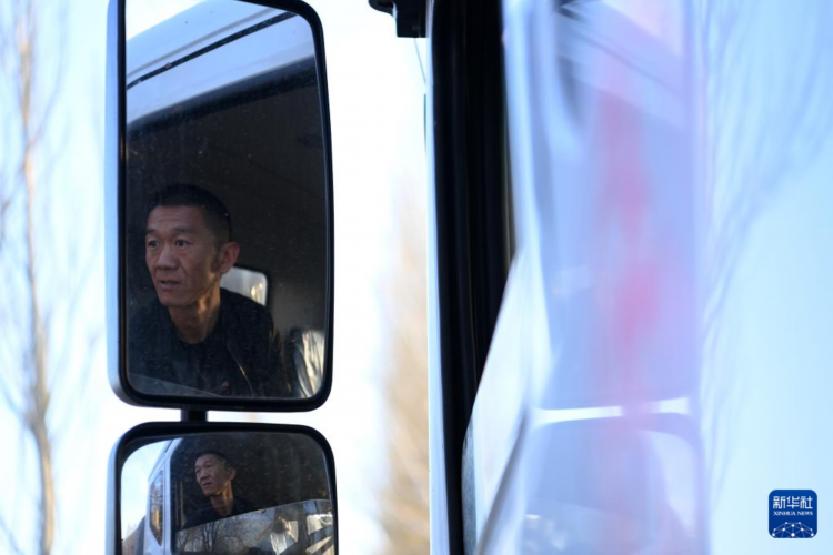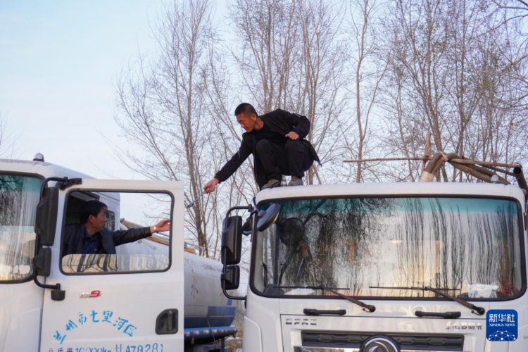 4月10日,在古浪县八步沙林场,郭玺从洒水车驾驶室查看外接水管出水情况。新华社记者 范培珅 摄
