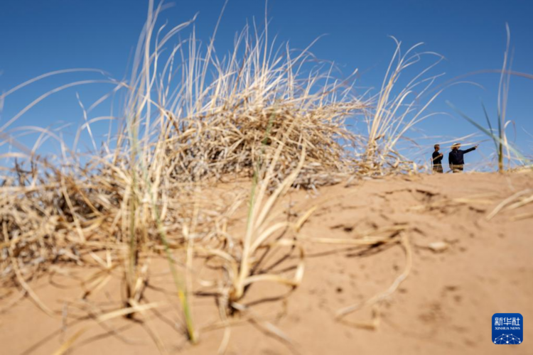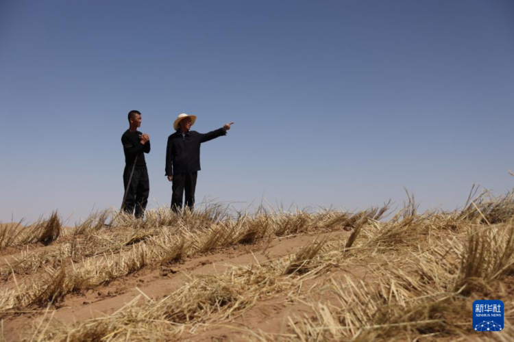4月10日,在古浪县八步沙林场麻黄塘沙区,郭玺(左)和郭万刚在交流。新华社记者 方欣 摄