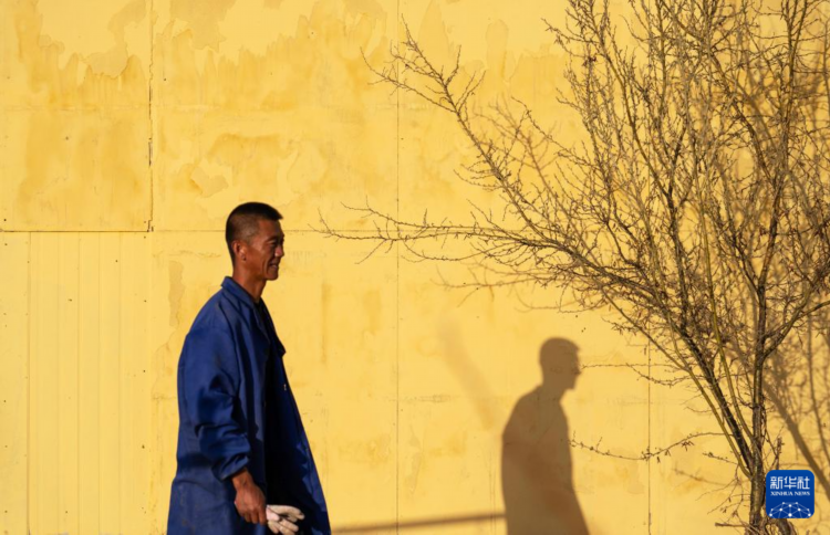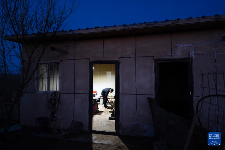 4月10日清晨,郭玺从古浪县土门镇的家中出发准备前往八步沙林场林下经济养殖专业合作社喂鸡。新华社记者 费茂华 摄
