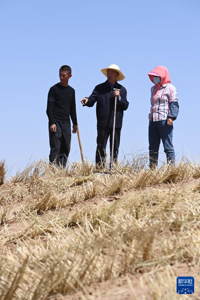 4月10日,在古浪县八步沙林场麻黄塘沙区,郭玺(左)听郭万刚(中)交代压沙注意事项。新华社记者 范培珅 摄
