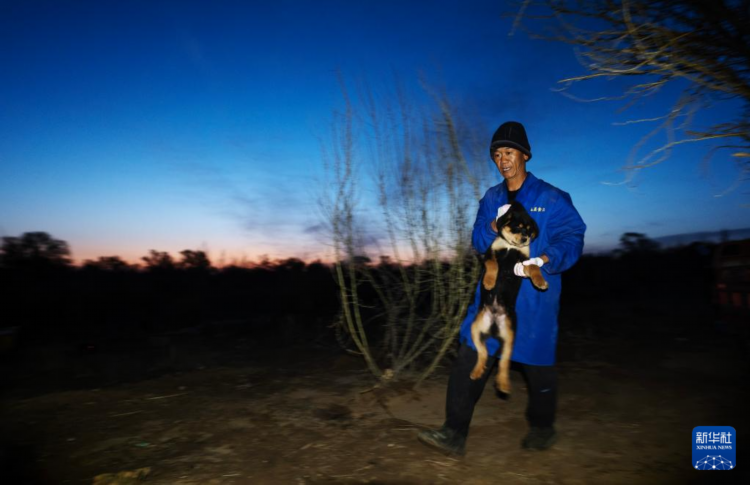 4月10日清晨,在古浪县八步沙林场林下经济养殖专业合作社,郭玺准备给养鸡场的护院小狗注射疫苗。新华社记者 费茂华 摄