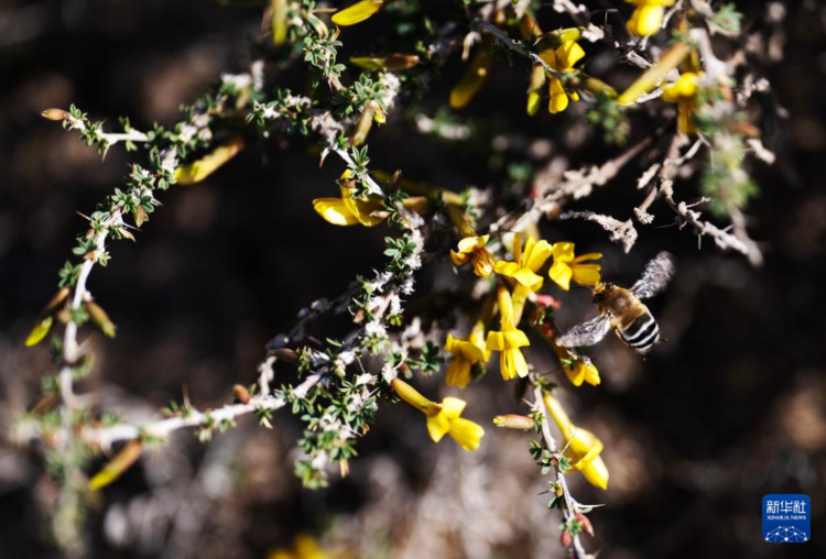 4月11日,在古浪县八步沙林场眼窝子沙治沙点,一只蜜蜂在采蜜。新华社记者 费茂华 摄