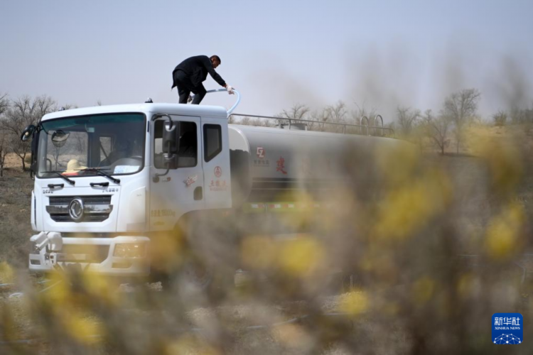 4月10日,在古浪县八步沙林场蓄水池,郭玺给洒水车加水。新华社记者 费茂华 摄