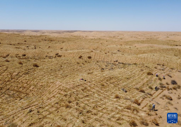 4月10日,群众在古浪县八步沙林场麻黄塘沙区用草方格压沙(无人机照片)。