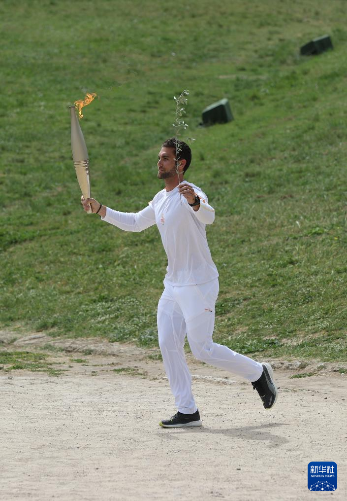 4月16日,第一棒火炬手——希腊运动员、东京奥运会男子赛艇项目金牌得主斯特凡诺斯·恩图斯科斯手持火炬进行传递。