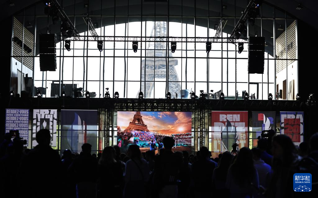 4月17日,人们参加庆祝活动。 当日,巴黎奥运会倒计时100天庆祝活动在法国巴黎埃菲尔铁塔附近的临时大皇宫举行。 新华社记者 高静 摄