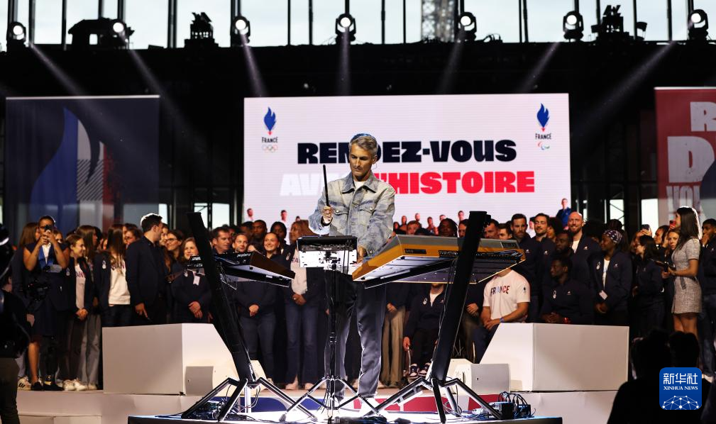 4月17日,艺术家在庆祝活动上表演。 当日,巴黎奥运会倒计时100天庆祝活动在法国巴黎埃菲尔铁塔附近的临时大皇宫举行。 新华社记者 高静 摄