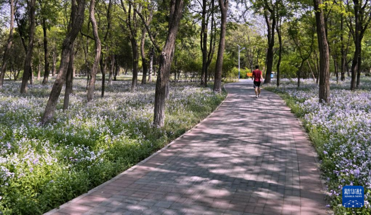 4月21日,市民在二月兰盛开的朝阳区京城森林公园内行走。