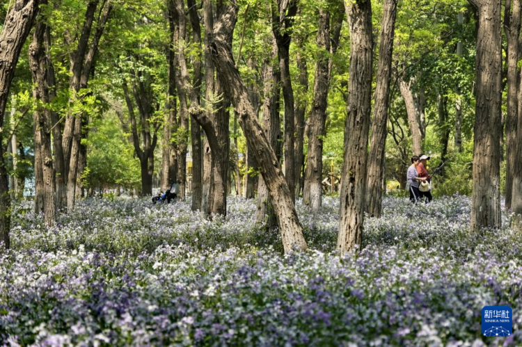 4月21日,市民在二月兰盛开的朝阳区京城森林公园游玩。