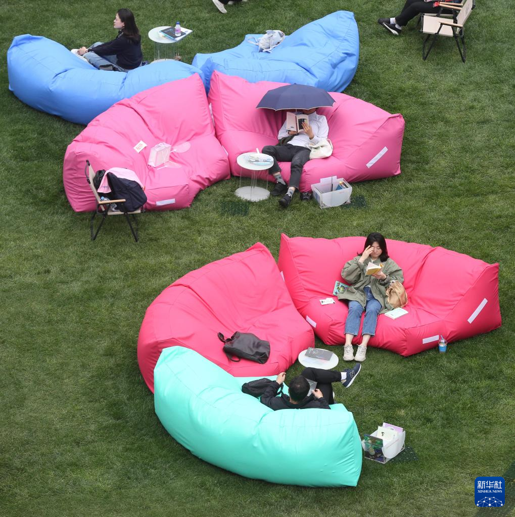 4月21日,市民在韩国首尔广场的露天图书馆读书。