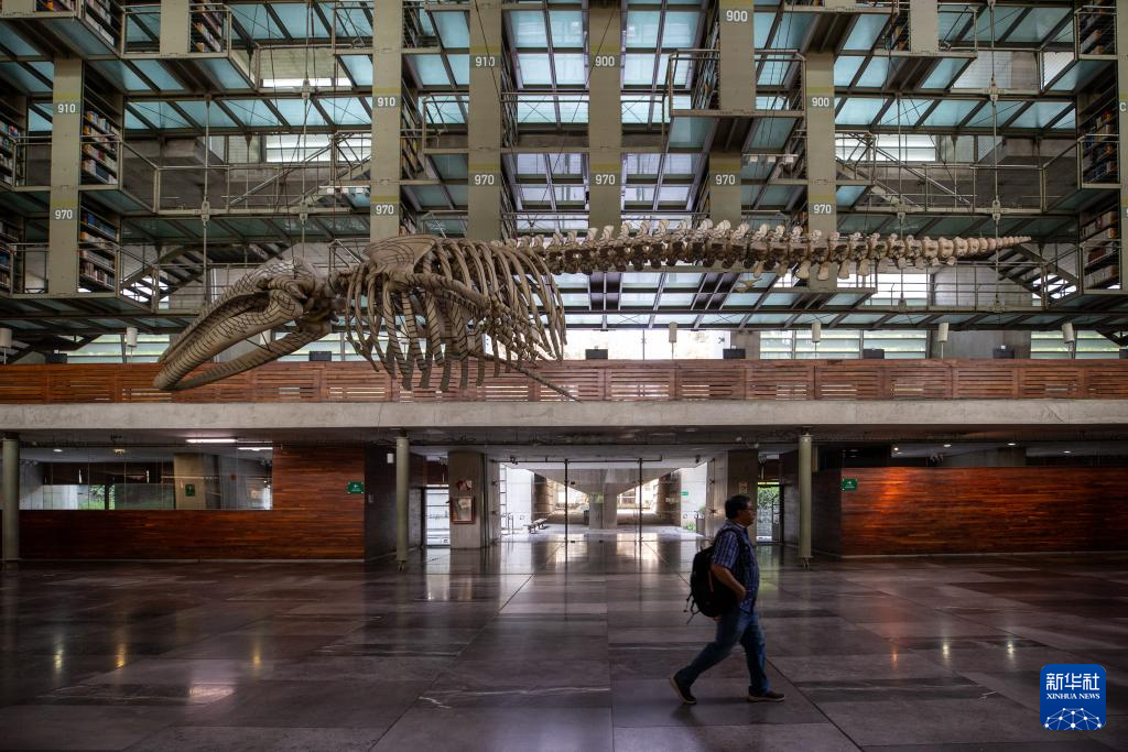 4月19日,在墨西哥首都墨西哥城的巴斯孔塞洛斯图书馆,一名男子走过馆内的灰鲸骨骼。