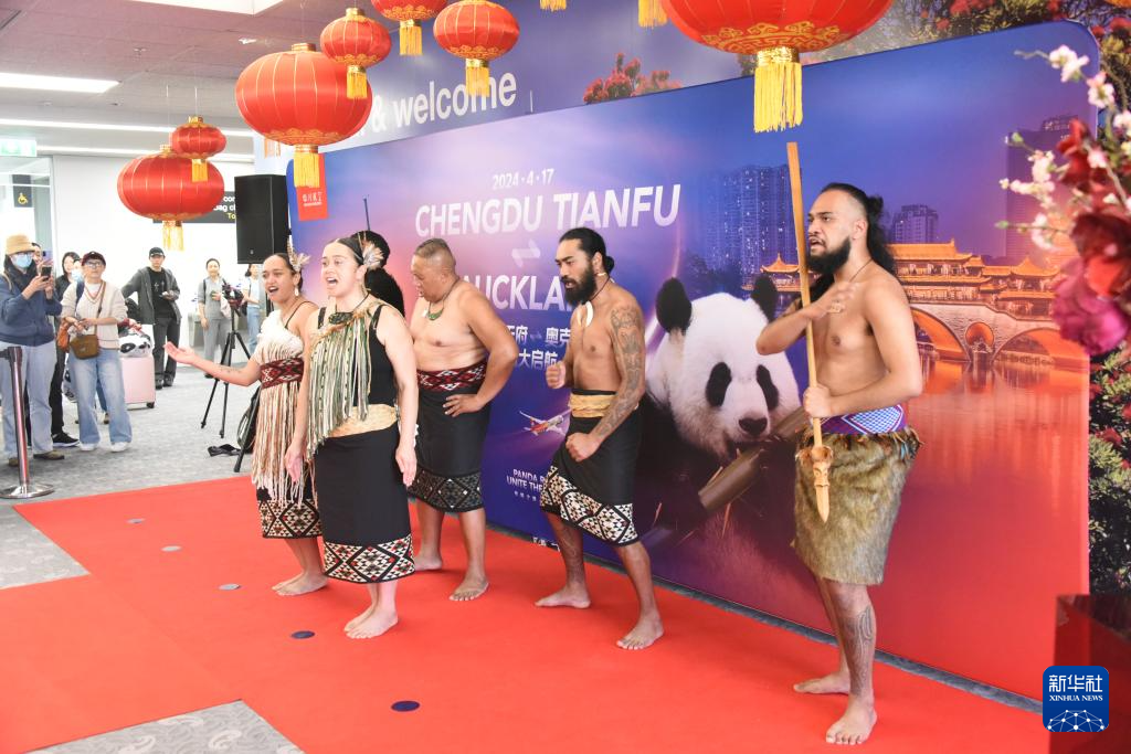 4月17日,在新西兰奥克兰国际机场举行的庆祝活动上,当地人表演新西兰传统毛利战舞欢迎来自成都的客人。